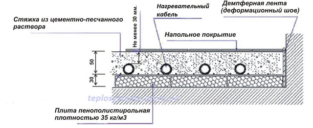 Нагрівальний кабель для систем електричного теплого статі укладають до укладання остаточної чистової цементно-піщаної стяжки - заввишки від 3 сантиметрів (мінімум) до 6-8 див. Якщо Вам потрібен просто комфортний теплий пол (швидкий або короткочасний нагрів), рекомендується інсталювати нагрівальний кабель як можна ближче до поверхні підлоги (висота стяжки мінімальна три – чотири сантиметри). Якщо мова йде про повноцінне опаленні приміщення або про додатковому опаленні, то для правильного вибору потужності системи опалення потрібно знати величину теплових втрат приміщення. Інстальована потужність для обігріву повинна бути в 1,2 – 1,4 рази більше розрахункових теплових втрат, висоту стяжки бажано збільшити (від 5 см до 8-10 см) – чим більше висота стяжки тим більше буде акумулятор тепла, а значить більше буде економія по електроспоживанню.